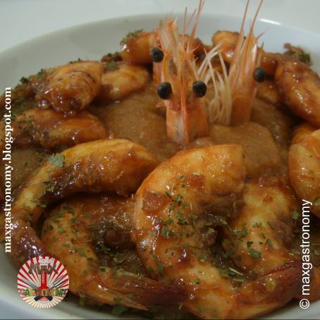 Quando estiver meio caramelizado, adicionar 4 colheres de sopa de água para afinar o caldo e adicionar o shoyu, o gengibre em pó, o molho de pimenta, uma pitada de pimenta do reino e uma pitada de sal a gosto. Misturar bem e adicionar os camarões. Deixar caramelizando os dois lados dos camarões. Aproximadamente 10 minutos. Desligar o fogo e reservar.