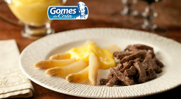 Aspargos Gomes da Costa com Tiras de Filé Mignon ao Molho Holandês