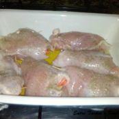 Sobre uma assadeira colocasse um manto de azeite e os bifes recheados...por cima temperasse com alho moido e salsa...