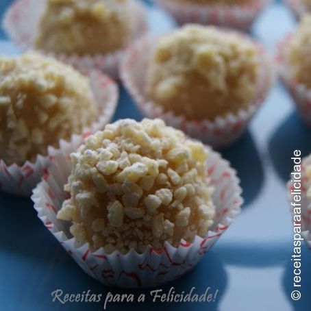 Molde 20 bolas de tamanhos iguais e passe-as pelo chocolate branco ralado e o açúcar em pó.
