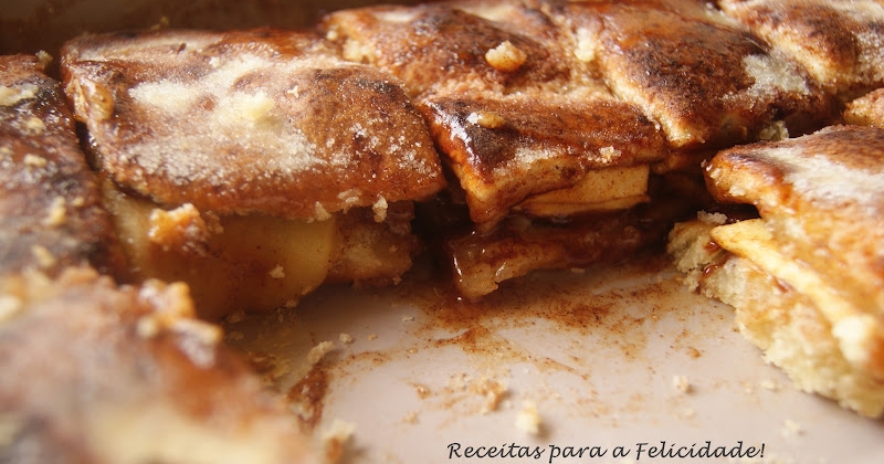 Estender a restante massa e colocá-la por cima das maçãs. Calcar ligeiramente com a ponta dos dedos, polvilhar de novo com açúcar e canela e, ainda cru, cortar a massa aos quadrados (tipo doses individuais) e levar ao forno por cerca de 25/30 minutos, ou até ficar douradinha.