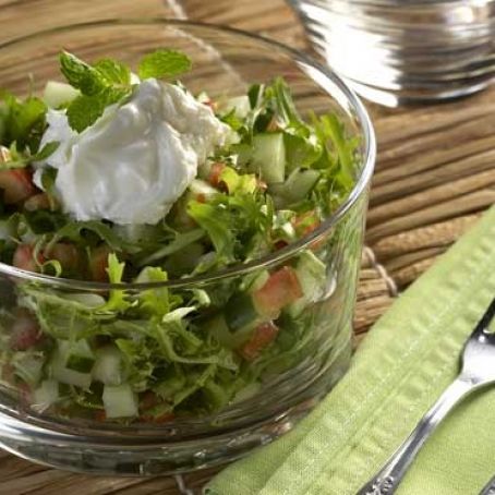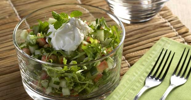Distribua a salada em cumbucas. Sobre cada uma coloque uma colher (sopa) de coalhada.