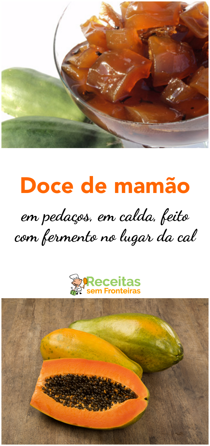 Lavar, descascar, retirar as sementes e cortar no tamanho desejado os mamões. Cobrir com água fria, colocar o fermento e deixar por 2h. Lavar bem e escorrer.