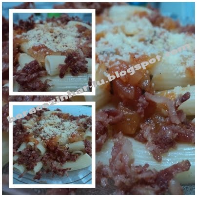 Em uma travessa coloque o macarrão, a calabresa e por cima o molho, se desejar salpique com queijo parmesão ralado.