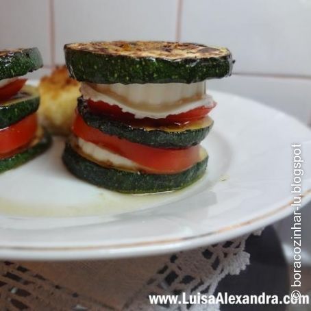 Coloca-se uma rodela de courgette grelhada, por cima uma fatia de queijo fresco, depois uma de tomate e assim sucessivamente.