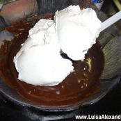 Adiciona-se as natas ao creme de chocolate, reservando uma pequena quantidade para decorar no final, às quais se juntam as 4 colheres de sopa de leite condensado para adoçar.