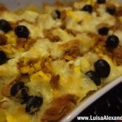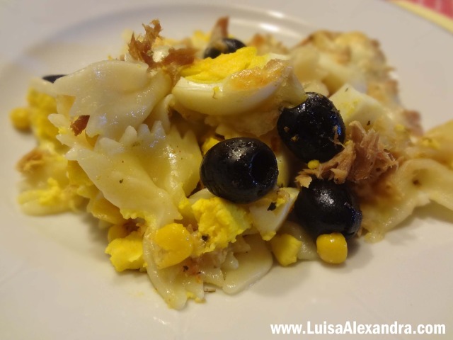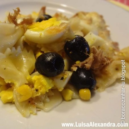 Farfalle com Ovo Cozido, Atum, Milho e Azeitonas em Gratinado de Mozarella Fresca