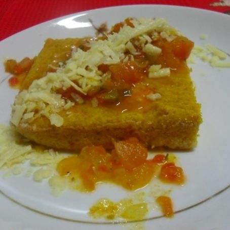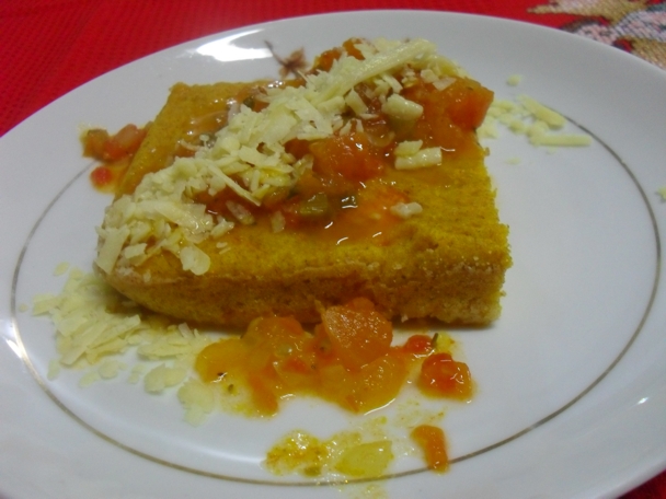 Cubra o bolo com um molho de tomate (caseiro) e polvilhe com queijo parmesão ralado! Sirva quente.