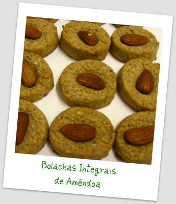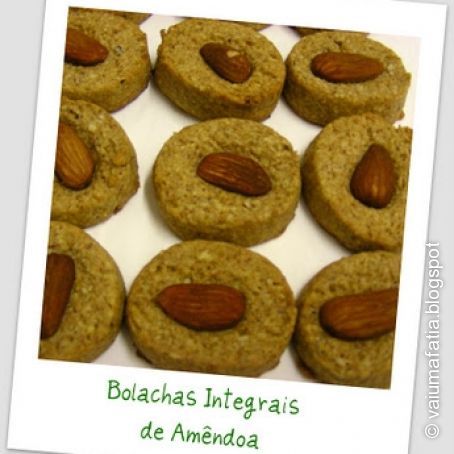Findo o tempo retirar os rolos, desembrulhar, e cortar às fatias com cerca de meio cm. Colocar em tabuleiro forrado com papel vegetal e antes de colocar no forno colocar uma amêndoa em cada bolachinha, pressionando bem.