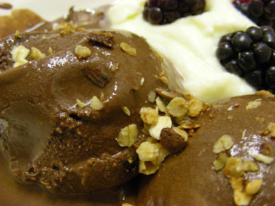 A foto da apresentação é do gelado já no dia seguinte, depois de estar no congelador. Permaneceu muito cremoso (bastaram meia dúzia de minutos fora do frio para formar as bolas), e os acompanhamentos deram alma a este gelado. Divino!