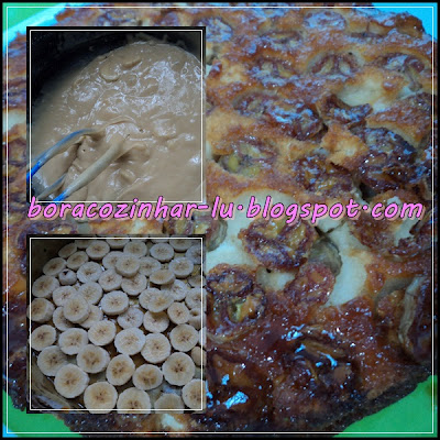 Caramelo: Leve o açúcar ao fogo até derreter bem. Jogue na forma e vá mexendo para que cubra toda ela. Disponha as banana sobre o caramelo e coloque a massa por cima.