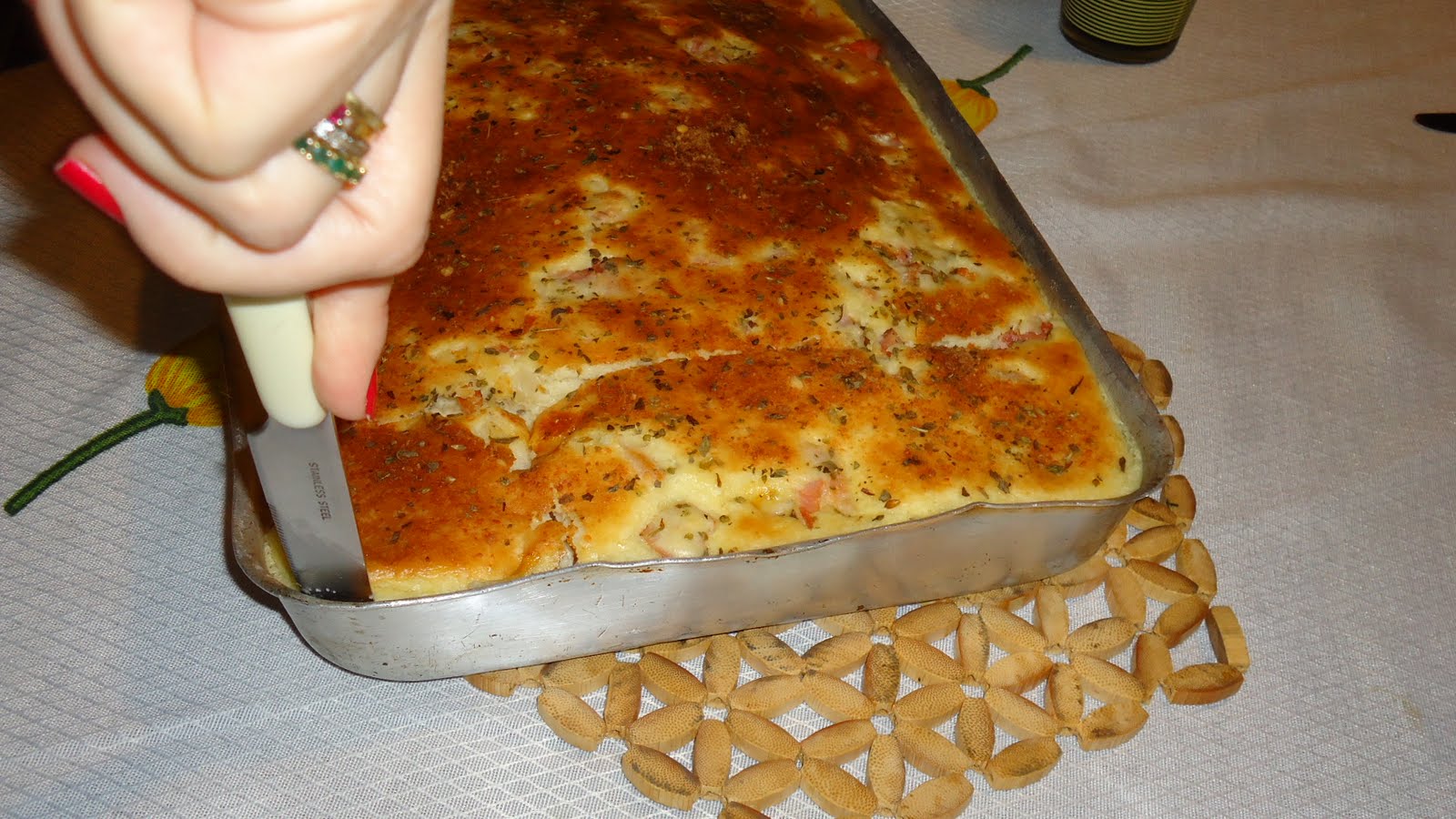 Bata no liquidificador os ovos, o leite, o óleo, o queijo ralado, a farinha de trigo, o fermento e o sal.