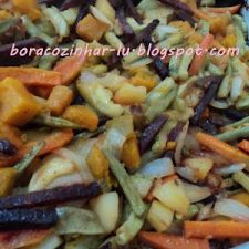 Levar ao forno preaquecido a 180ºC até que os legumes estejam macios. Ajustar temperos e servir.