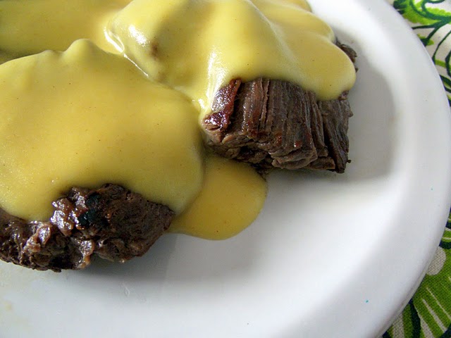 Na mesma frigideira, acrescente a manteiga, a farinha de trigo, 1 xícara (chá) de água quente e a mostarda. Mexa bem, desligue o fogo e coloque o molho sobre os medalhões reservados. Sirva.