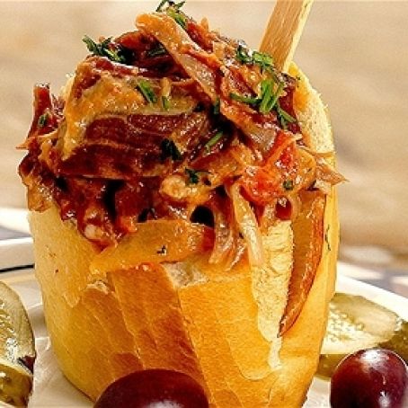 Corte as baguetes ao meio e retire o miolo. Ponha metade de uma fatia de queijo em cada metade e recheie com a carne quente. Sirva em seguida.