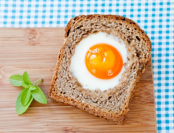Em uma das fatias de pão com uma colher retirar um circulo bem do meio da fatia (ou fazer outro desenho). Reserve.