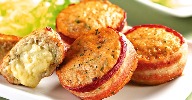 Achate as bolinhas formando medalhões, envolva cada um com uma fatia de bacon e prenda com um palito.