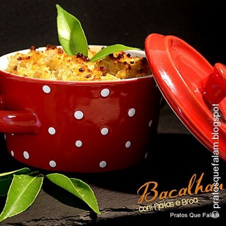 Pincele um tabuleiro com azeite, coloque o bacalhau e espalhe-o bem. Por cima do bacalhau, espalhe o restante molho. Cubra tudo com a broa.