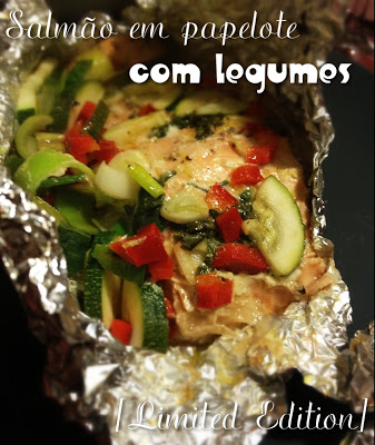 Começar por preparar a marinada. Abrir as folhas de alumínio e temperar o salmão com o sumo de limão, alho, sal, pimenta e coentros frescos picados. Deixar repousar durante a tarde [entretanto podem aproveitar para fazer uma série de coisas úteis, como ir ao ginásio, limpar a casa ou trabalhar na tese]. Cortar os legumes e juntá-los ao salmão, salpicar com azeite e fechar o papelote. Levar a forno pré-aquecido a 180º durante cerca de 40m. Verificar se o salmão está cozinhado abrindo um pouco do embrulho e confirmando a cor do salmão por dentro. Como as postas de salmão eram enormes, acompanhámos apenas com salada.