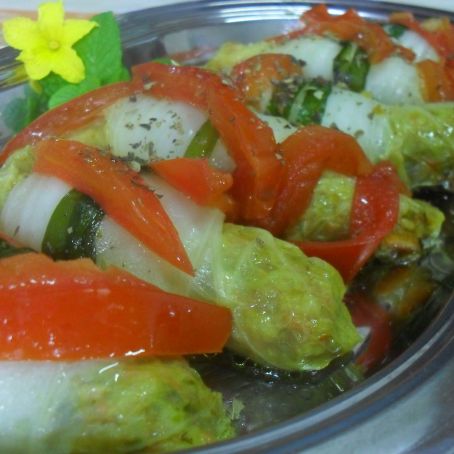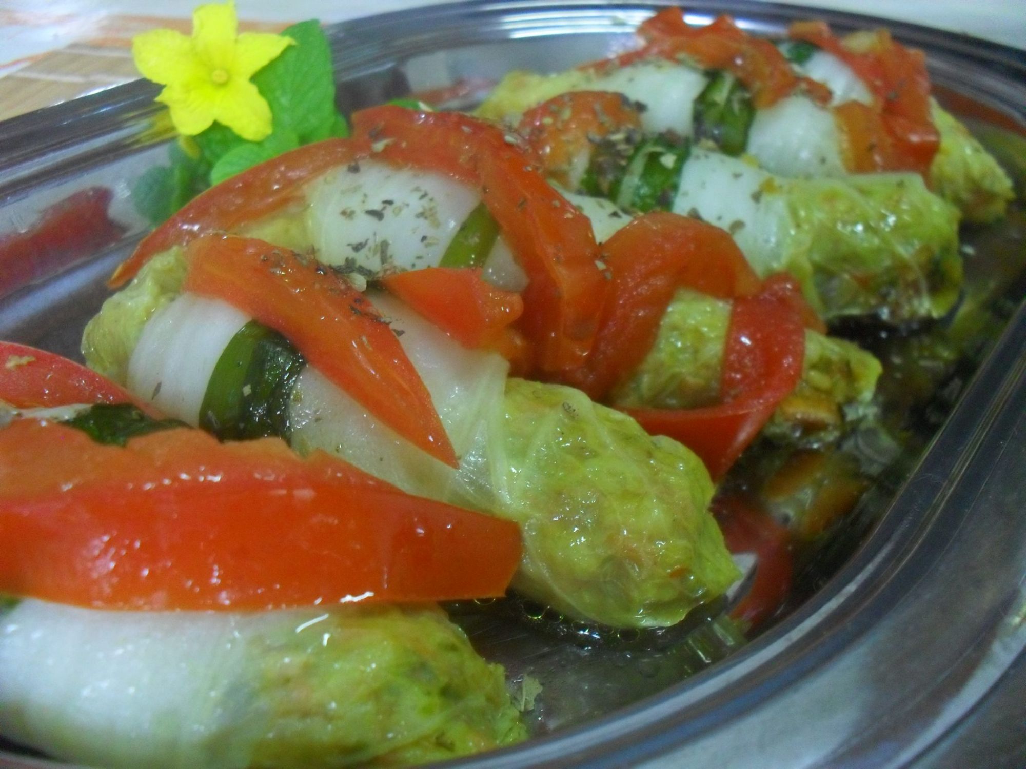 Por cima das trouxinhas, coloque cebola e tomate, cortados em tiras. Leve ao fogo baixo e, depois de 10 minutos regue com azeite e shoyu e deixe mais 5 minutos.