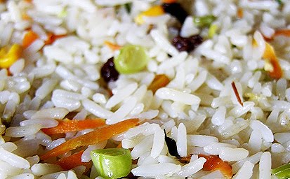 Em um refratário coloque o arroz já cozido misture a cebolinha e a salsa, a cenoura cozida e fria, os pimentões, a ervilha e as passas de uva preta e branca