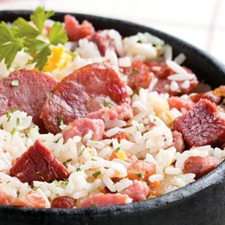 2. Acrescente a carne seca, o arroz e refogue por alguns segundos, mexendo sem parar. Tempere com o sal e a pimenta.