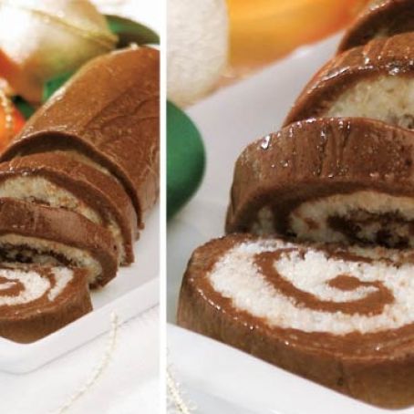 Abra a massa sobre um pano e vire o recheio. Com o pano, enrole o rocambole. Cobertura: Leve os ingredientes ao fogo e vire por cima do doce.