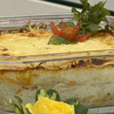 3 - Num refratário redondo (30 cm de diâmetro) coloque metade da mistura de batatas com cenoura (reservada acima) espalhando bem, metade do creme de queijo, 300 g de frango cozido e desfiado (ou 300 g de lingüiça calabresa picada), a outra metade da mistura de batatas com cenoura e a outra metade do creme de queijo.