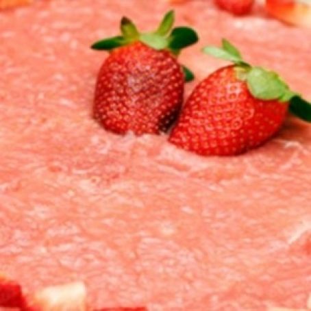 Espalhe a cobertura quando a mousse estiver firme e depois de desenformar a torta. Enfeite com morangos