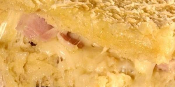 Abra a massa e espalhe o restante da margarina, recheie com presunto e mussarela