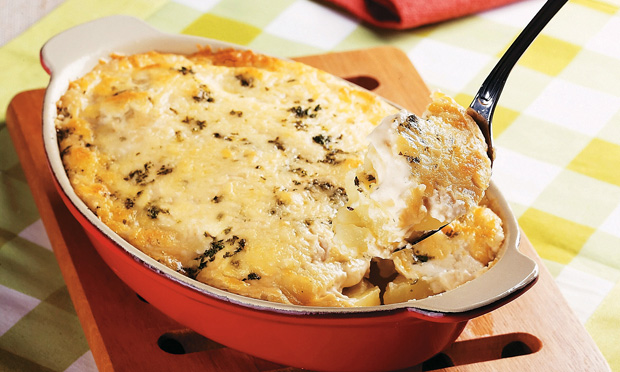 Cozinhe a batata, descascada, sem deixar que amoleça muito. Escorra e corte em fatias. Derreta a manteiga, junte o orégano e a noz-moscada. Em um refratário, monte camadas de batata, manteiga derretida e mussarela ralada. Reserve. Dissolva a farinha de trigo no leite, junte o creme de leite e o caldo de legumes. Coloque o creme sobre a batata, salpique o parmesão ralado e leve ao forno por preaquecido a 200ºC por 25 minutos ou até derreter o queijo.