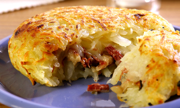 Aqueça uma frigideira com 20 cm de diâmetro ou omeleteira e unte-a com óleo. Coloque metade da batata e aperte levemente, subindo um pouco na lateral. Recheie com a mistura de carne e cubra com a batata restante, apertando levemente.