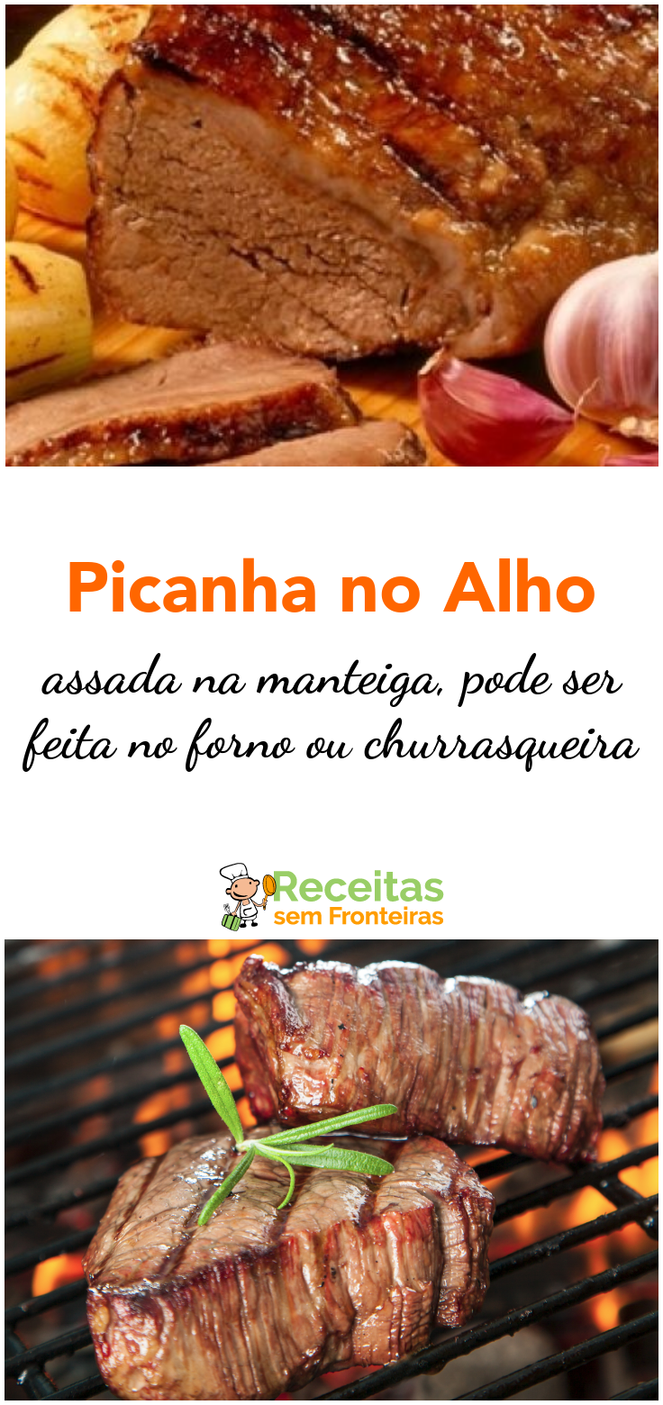 Esta picanha ao alho é assada na manteiga e pode ser feita em churrasqueira ou forno convencional! Prática e deliciosa!