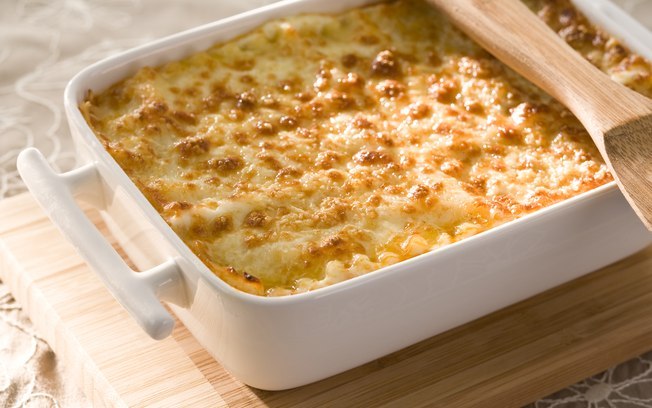 de lasanha, mussarela, presunto, molho e queijo parmesão.