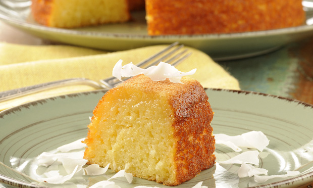 4. Coloque em uma forma média untada e asse em forno, preaquecido, a 180 ºC por cerca de 30 minutos. Desenforme e decore com tiras de coco.