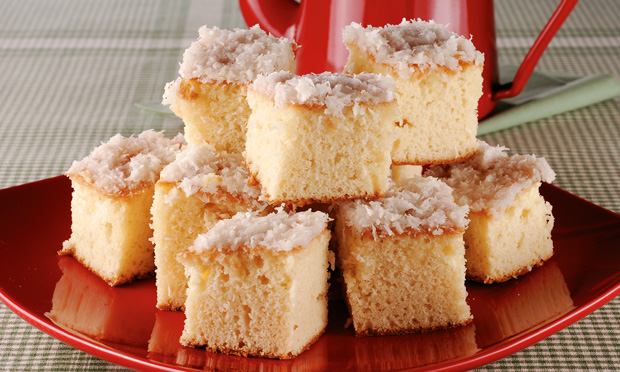 7. Acrescente o coco, mexendo bem por 2 minutos. Fure o bolo com um garfo e regue com a calda.