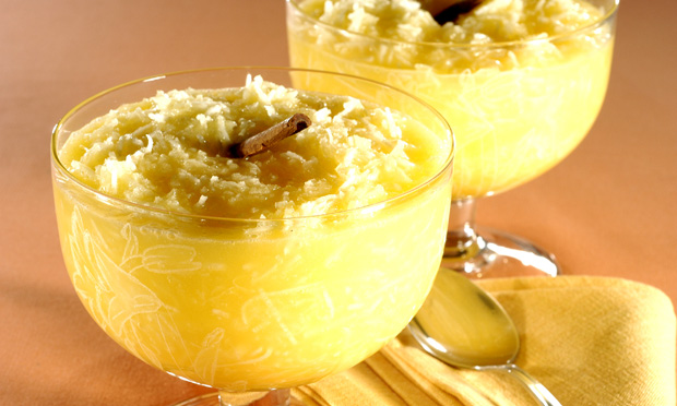Devolva ao fogo baixo e, quando começar a ferver, junte o coco e a manteiga. Misture vigorosamente e retire do fogo. Deixe esfriar. Sirva decorado com pau de canela. Bom apetite.