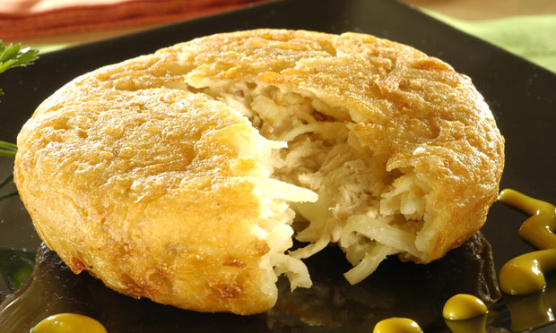 Refogue o frango com o azeite, a cebola e o tomate. Tempere com o sal e a pimenta e retire do fogo. Desfie o frango e junte o requeijão, até formar uma pasta. Separe duas frigideiras pequenas. Unte uma delas e cubra o fundo com a batata ralada. Ponha no centro da frigideira 2 colheres (sopa) bem cheias do recheio e cubra com o restante da batata. Com a colher, aperte e molde a batata, para que fique arredondada, e cubra com a outra frigideira como se fosse um tostex. Cozinhe por cerca de 10 minutos de cada lado. Regue com um fio de azeite ao virar a batata.