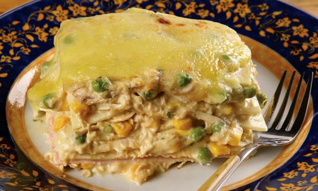 Cozinhe o peito de frango em água com o tablete. Escorra e reserve o caldo. Desfie a carne e reserve. No liquidificador, coloque o leite, a cebola, a maionese, o ketchup, a farinha de trigo e o caldo que sobrou do cozido. Passe para uma panela e cozinhe, mexendo sempre, até engrossar. Junte o frango desfiado, o leite de coco, o milho e a ervilha, o creme de leite e o cheiro-verde. Deixe aquecer e retire do fogo. Para montar a lasanha, use um refratário. Alterne camadas de massa e de recheio de frango e de presunto. Por fim, cubra com a mussarela. Leve ao forno preaquecido com temperatura quente até dourar. Se quiser, polvilhe queijo ralado e sirva.