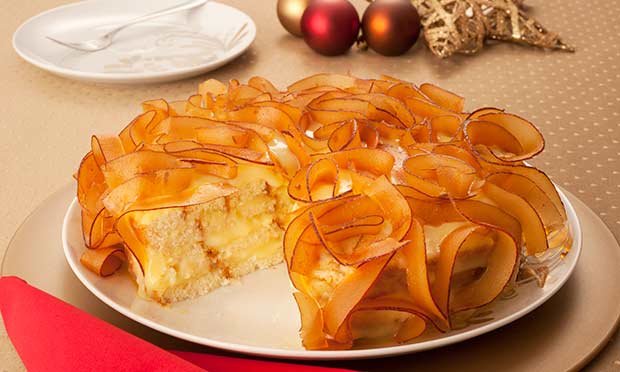 Em uma forma com fundo falso forrado com papel-manteiga, monte o pavê, alternando camadas de pão de ló, creme e nozes, e finalize com o creme. Cubra com filme plástico e gele de um dia para o outro. Desenforme, retire do papel e decore com as fitas de coco escorridas.