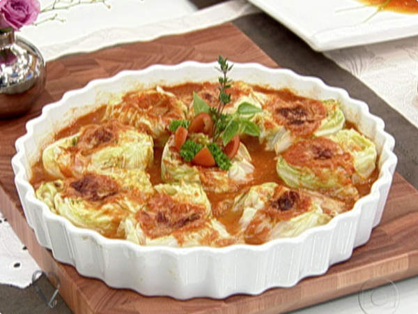 2°- Coloque numa tigela coloque 1 cenoura média cozida e amassada, 1 ½ xícara (chá) de mussarela ralada no ralo grosso, 1 xícara (chá) de frango cozido e desfiado, 1 colher (sopa) de margarina, 1 ovo batido, 2 colheres (sopa) de salsa picadinha, sal e pimenta do reino a gosto e misture bem. Coloque esta mistura no meio do retângulo de folhas do repolho (reservado acima) e cubra com um dos lados das folhas. Com a ajuda do pano de prato, enrole sobre a mistura formando um rocambole. Leve este rocambole para a geladeira por pelo menos 3 horas para firmar, enrolado no pano.