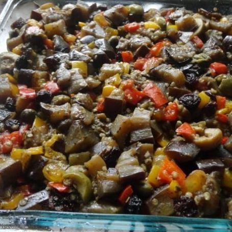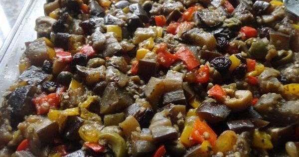 Depois de refogado a cebola, forme camadas de beringela, cebola e pimentão. Na última camada, colocar as azeitonas e as uvas passas. Por último, coloque o vinagre e o molho de soja, abafe com a tampa da panela e deixe cozinhar em chama média até reduzir o volume.