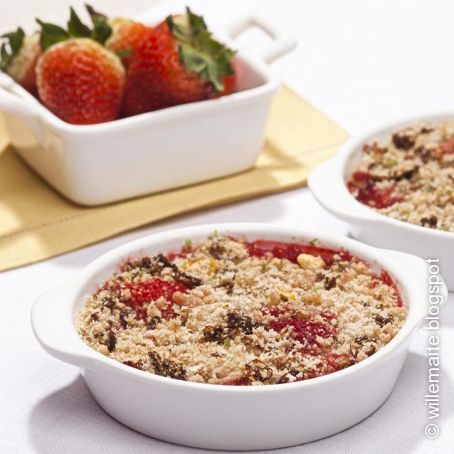 Distribua sobre os morangos e leve ao forno médio (180°C), preaquecido, por cerca de 10 minutos ou até dourar levemente. Sirva quente.