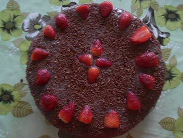 Desenforme o bolo depois de frio, corte ao meio, espalhe o recheio de morangos e cubra com o brigadeiro restante