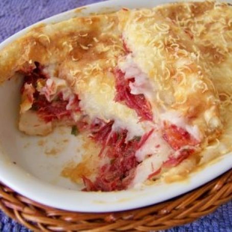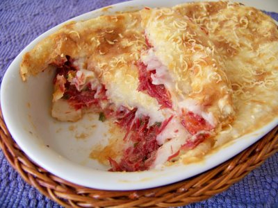 - Colocar a carne seca, colocar as fatias de mussarela, por cima o purê