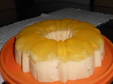 Forrar o fundo de um refratário com o doce de abacaxi e por cima dele, despejar a mistura.