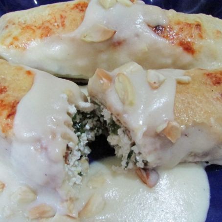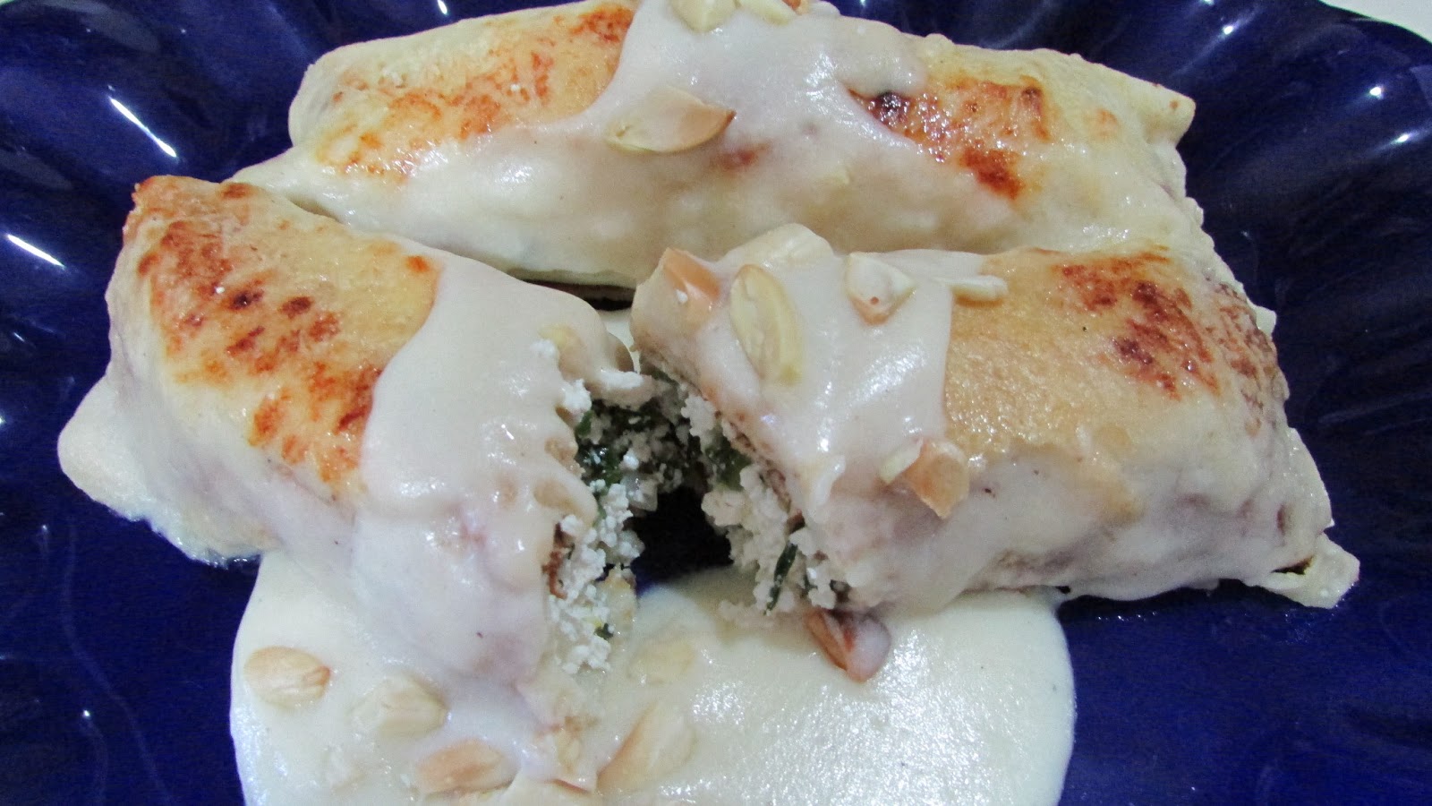 Para o recheio, tempere a ricota com sal, noz-moscada e pimenta à gosto. Coloque o espinafre para cozinhar na água e sal, por cinco minutos. Escorra, pique com a faca, e jogue na ricota temperada. Coloque um pouco da mistura numa das extremidades da massa e forme os rolinhos da panqueca. Arrume-a em um refratário. Cubra com o molho de sua preferência e leve ao forno para gratinar. A dica é um molho branco básico.