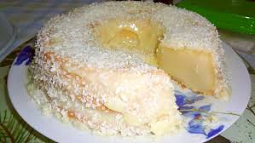 O bolo fica com consistência de uma queijada e é muito gostoso