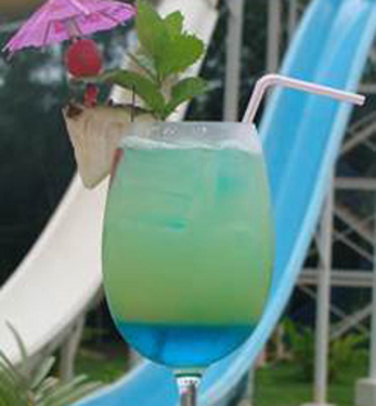 Coloque as pedras de gelo no copo e adicione o curaçau blue. Em seguida, acrescente com cuidado o suco de abacaxi, depois a vodka e, por último, a soda - até completar o copo. O drink fica lindo quando decorado com origami, um pedaço de abacaxi em formato de triângulo e folhas de hortelã.