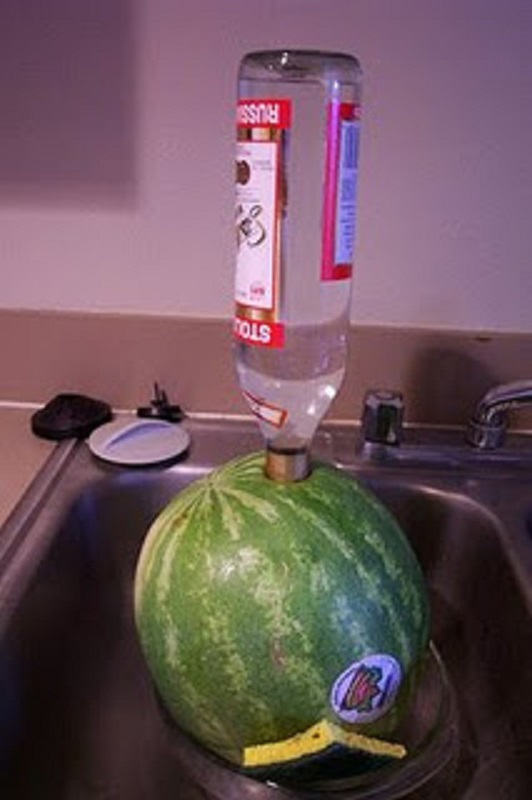 Faça um furinho na melancia grande e fundo o suficiente para encaixar um funil. Vá colcando aos poucos algumas doses de vodka. Quando a melancia estiver cheia, tampe o furinho e leve à geladeira. Repita esse procedimento por mais 2 ou 3 dias seguidos. Sempre colocando vodka até encher a melancia. No dia do evento, corte a melancia em pedaços e dê para os convidados se lambuzarem.